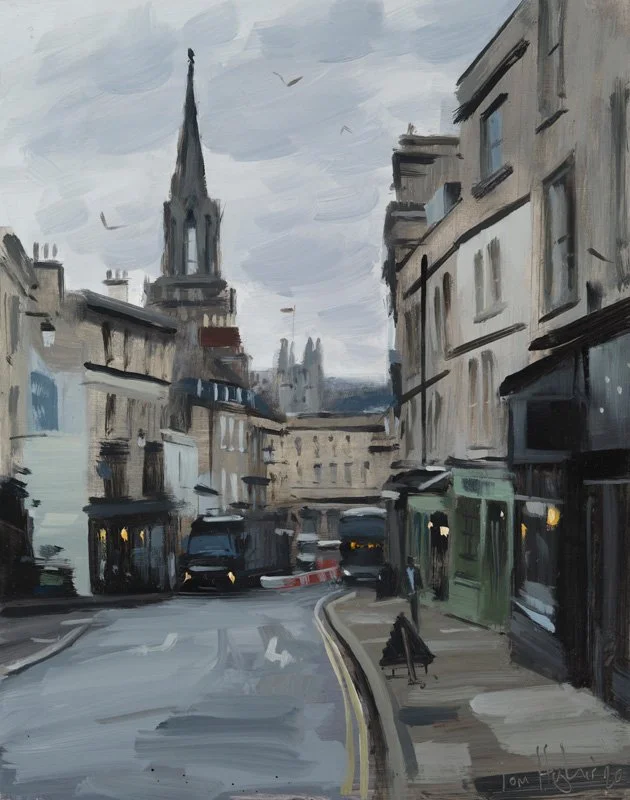 Misty day on Milsom St, Bath, March - 36 x 28cm 14 x 11" - Oil on board